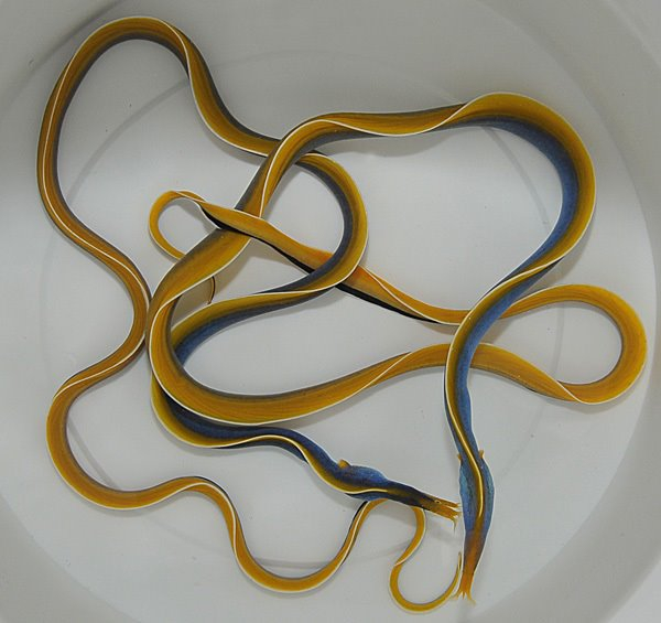 Rhinomuraena quaesita (Blau) Nasen-Muräne, Geistermuräne, Nasenmuräne zeichnet sich durch ihre einzigartigen Merkmale aus: einen langen, „bandartigen“ Körper, filigrane Kiefer und röhrenförmige vordere Nasenöffnungen mit einer auffälligen, fächerartigen Erweiterung.
